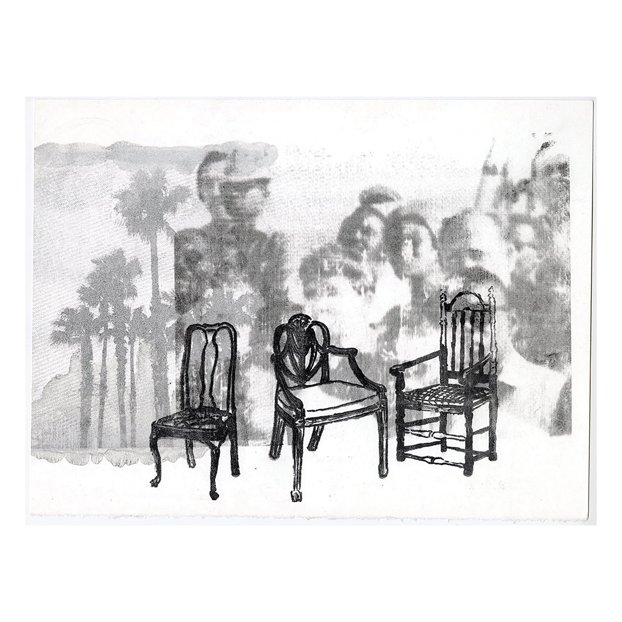 In order, above gallery: Part of the Romantic Caribbean, mixed-media installation and selected Works on Paper, mixed screen printing with graphite powder and overlayed hand-drawings with liquid graphite or watercolour.
