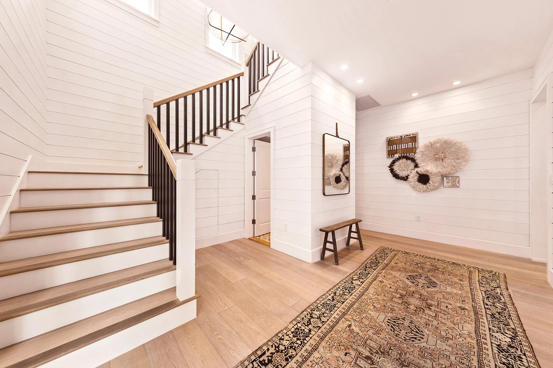 Despite its generous size, the white shiplap walls and white oak floors lend