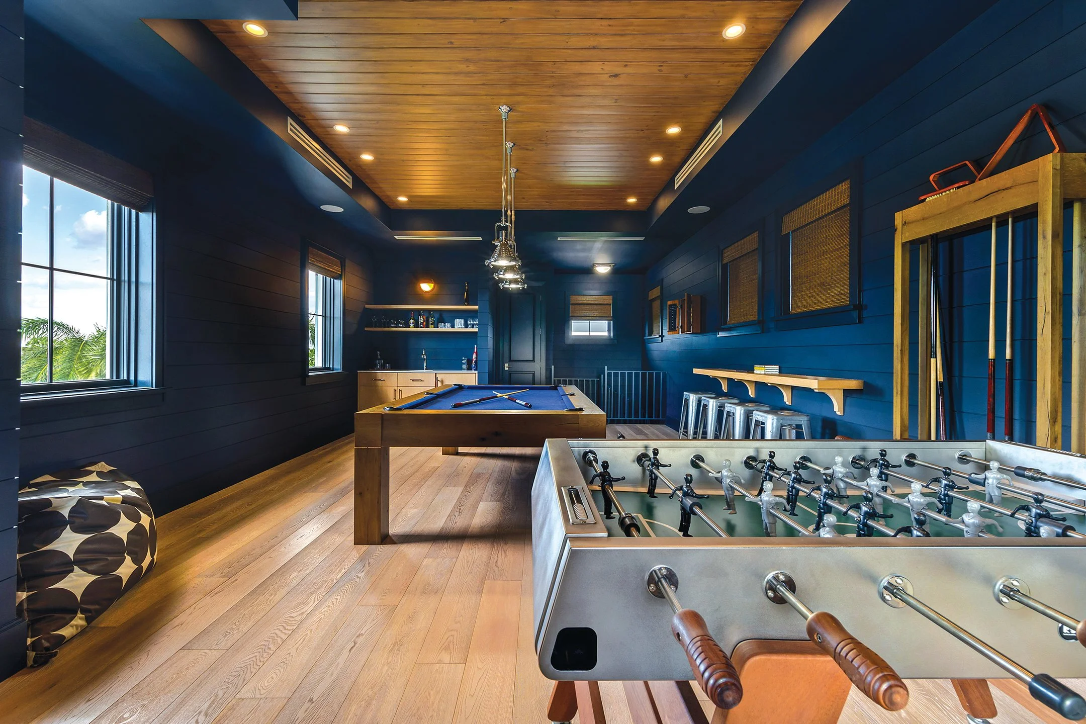 The one exception to the fresh, white palette – as requested by her husband – is the games room. This adult playroom is colour-drenched in a deep, dark blue, with a rich wood-panelled ceiling, and chrome pendant lights that look like something salvaged from an ancient ship. Complete with a bar, pool table, foosball, and gaming station, it is the perfect, moody space to unwind in style.