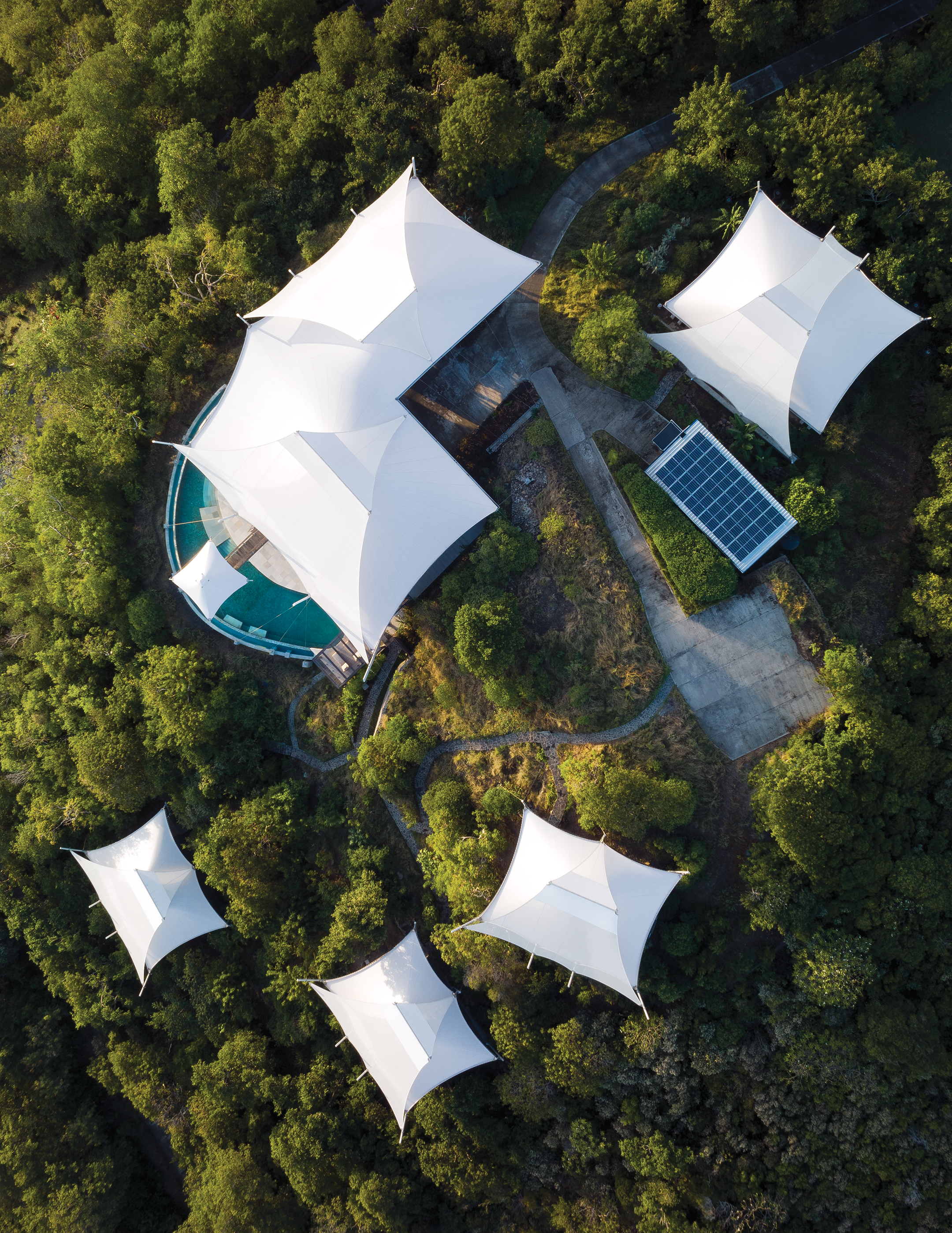From a distance, the white, swooping roofs of The Sail House have an almost ethereal appearance, like butterflies hovering over the densely forested hillside. Zoom in though, and the impression changes: the white wings become sails supported by aluminium masts, stretched tight over timber decks, with a gangplank reaching out to a circular crow’s nest.